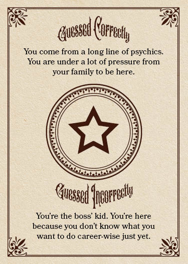 The game also features Zener cards, designed by perceptual psychologist Karl Zener in the 1930s to (inaccurately) test people for ESP. These provide a pseudo-randomization for the players’ traits as they develop their character in the game. What I really like about this is that it’s an avenue for improvisation. You never really know what your character is going to be like until you start playing the game!