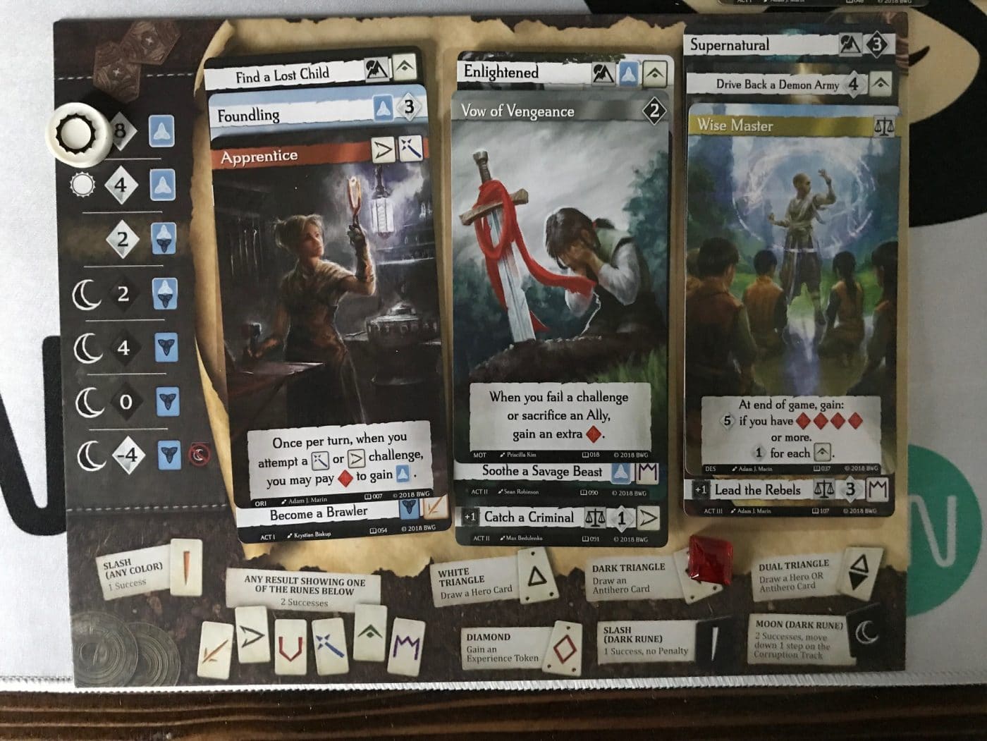 As players make decisions and begin to fill up their tableau, they’re going to be progressing on the Corruption track. This limits the types of cards that can be played to interact with the other characters; the more corrupt a character becomes, they lose the ability to play Hero cards and vice versa.